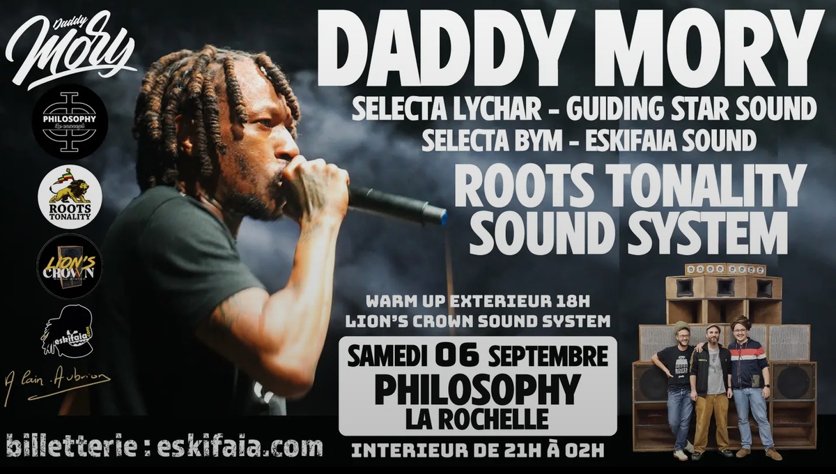 👉 Une soirée reggae dub sound system mémorable à La Rochelle avec Daddy Mory, Roots Tonality Sound System, Eskifaia, Guiding Star et Lion’s Crown – vibes garanties le 6 septembre 2025 au Philosophy Le Concept