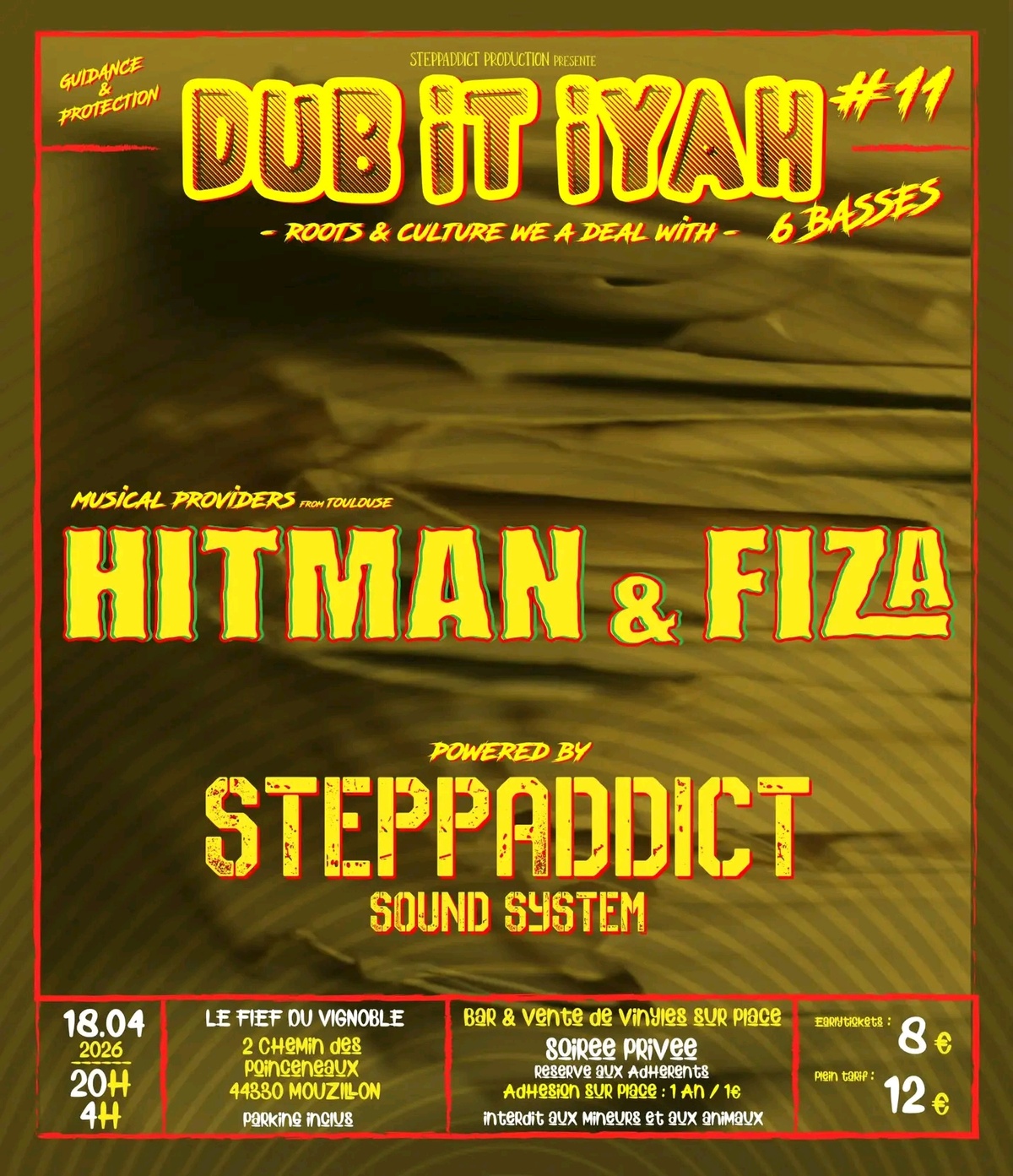 On est partis pour une onzième édition des Dub It iYah ! Et cette fois ci on vous invite à un voyage musical dans le sud ouest de la France, en invitant le duo Hitman & Fiza ! Producteurs et soundmen, ils se sont démarqués par leurs productions maisons sorties en dubplate et en vinyle sur leur label Kettle Records. Originaires de la région toulousaine, ils viendront partager la session avec l'équipe Steppaddict pour une danse qui promet d'être mémorable !