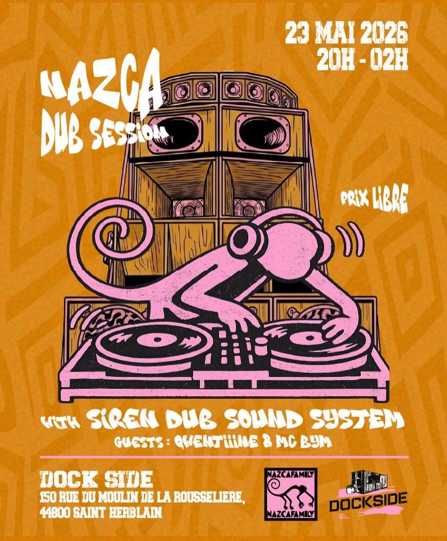 NAZCA DUB SESSION 🐒 On vous embarque au @dockside.food.hall le 23 mai pour une session dub bien épicée, en collab avec les copains @siren.dub.soundsystem Programme 100 % dub avec un finishing dub fi dub à la Nazca ! Guests : @qwentiiine_ et @selecta_bym 📆 Rendez-vous le 23 mai au Dock Side 📍 150 rue du Moulin de la Rousselière, 44800 Saint-Herblain 🔊 Sonorisation by Siren Dub Sound System 🕐 20h - 02h 🎟️ Prix libre